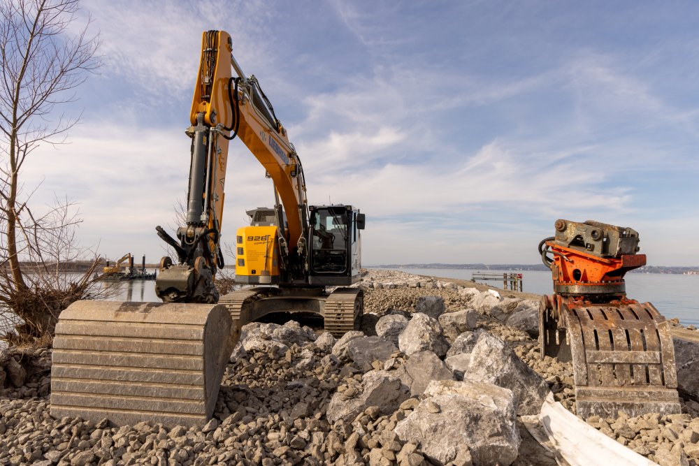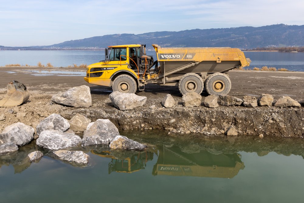 Um diese Ziele zu erreichen, wird der rechte Vorstreckungsdamm im Bereich Hard-Schleienlöcher auf einer Länge von ca. 800 Metern (km 90.20-91.00) um maximal einen Meter erhöht. Auf den anschliessenden 800 Metern (km 91.00-91.80) wird der Damm tief gehalten und überströmsicher ausgebaut. Eine Verkleidung mit Wasserbausteinen sorgt dafür, dass das Wasser, wenn es wie vorgesehen an dieser Stelle über den Damm in den Bodensee strömt, keinen Schaden anrichten kann. Auf den nächsten 400 Metern zwischen km 91.80-92.20 wurde der Damm bereits im Frühjahr 2023 um maximal 0.2 Meter erhöht und baulich auf den neuesten Stand gebracht. Die Schiffanlegestelle für die MS Österreich und das DS Hohentwiel wurde den neuen Gegebenheiten angepasst. Die Höhen beider Vorstreckungsdämme werden im Zuge dessen auf ganzer Länge geprüft und bei Bedarf an die Projektvorgaben angepasst. Zum Abschluss steht die Umsetzung ökologischer Gestaltungsmassnahmen auf dem Bauprogramm. Diese dienen dazu, naturnahe und strukturreiche Lebensräume zu schaffen bzw. zu erhalten. Die Gesamtkosten für dieses Bauprojekt sind mit ca. sechs Millionen Euro veranschlagt und werden von der Internationalen Rheinregulierung, also der Schweiz und Österreich, getragen.
